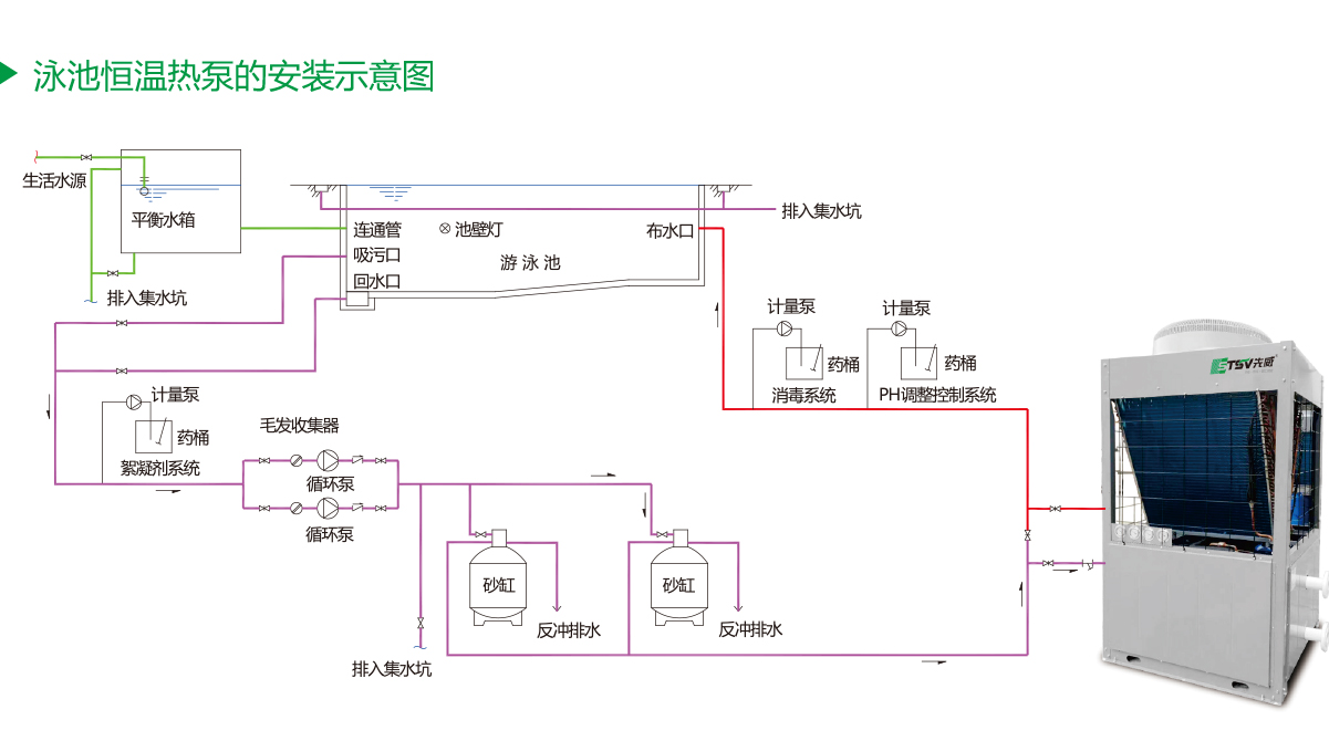 泳池?zé)岜靡蚱涞蜏責(zé)嵩捶N類不同,其工作原理也有所區(qū)別:地下水泳池?zé)岜孟到y(tǒng),就是將地下水井內(nèi)的地下水抽出送入泳池?zé)岜脵C(jī)組,與泳池?zé)岜玫墓ぷ鹘橘|(zhì)進(jìn)行熱量交換后再回灌到原來的地層中去;地表水泳池?zé)岜孟到y(tǒng),就是將江河的水在循環(huán)水泵的驅(qū)動(dòng)下,經(jīng)過處理直接流經(jīng)泳池?zé)岜脵C(jī)組或通過中間換熱器進(jìn)行熱交換的系統(tǒng);土壤源泳池?zé)岜孟到y(tǒng),就是以大地土壤為熱源將熱泵的換熱器埋在地面以下,利用泵的循環(huán)液體與大地土壤進(jìn)行冷熱交換的系統(tǒng);空氣源泳池?zé)岜孟到y(tǒng),就是利用專用的工質(zhì)吸收大氣中的熱量進(jìn)行熱交換的系統(tǒng)。