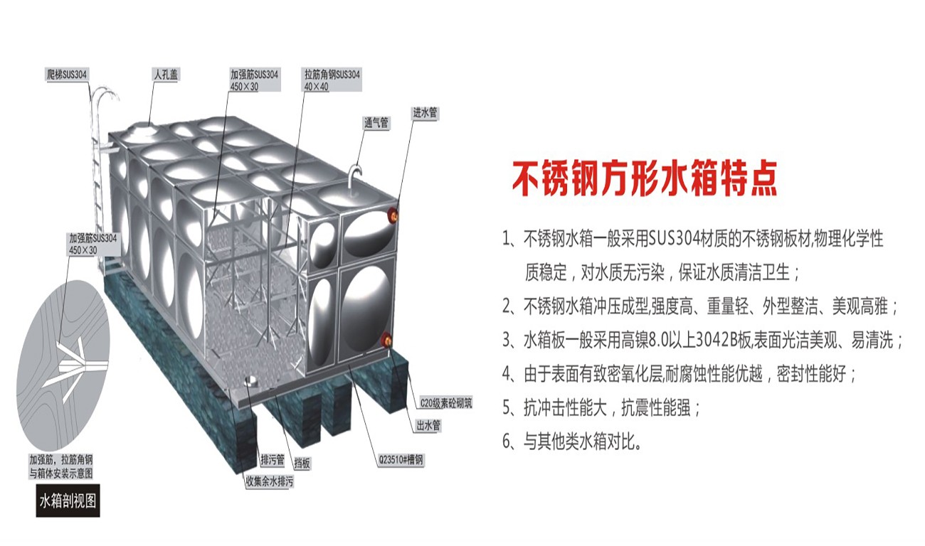 不銹鋼水箱是繼玻璃鋼水箱之后新一代水箱產(chǎn)品,其產(chǎn)品采用SUS304不銹鋼板精工模壓而成,造型美觀,經(jīng)濟(jì)實用,主體長久不壞。不銹鋼水箱與其他水箱相比,具有外形美觀、重量輕、強度高、耐腐蝕、耐高溫、水質(zhì)清潔,防滲,抗震,永不生青苔,水質(zhì)無二次污染,安裝方便,無需維修,便于清洗等諸多優(yōu)點。